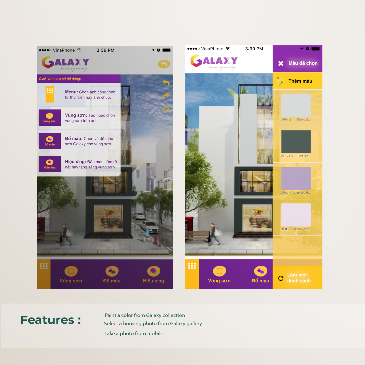 The users then can select colors from the Galaxy collection and paint the house. Multiple colors are supported